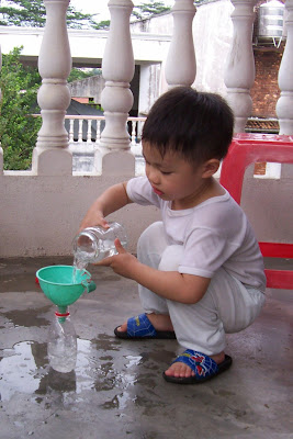 Joe found a new toy in Seremban. His father showed him what a funnel is ans its function as well. First he filled a jar with water.
